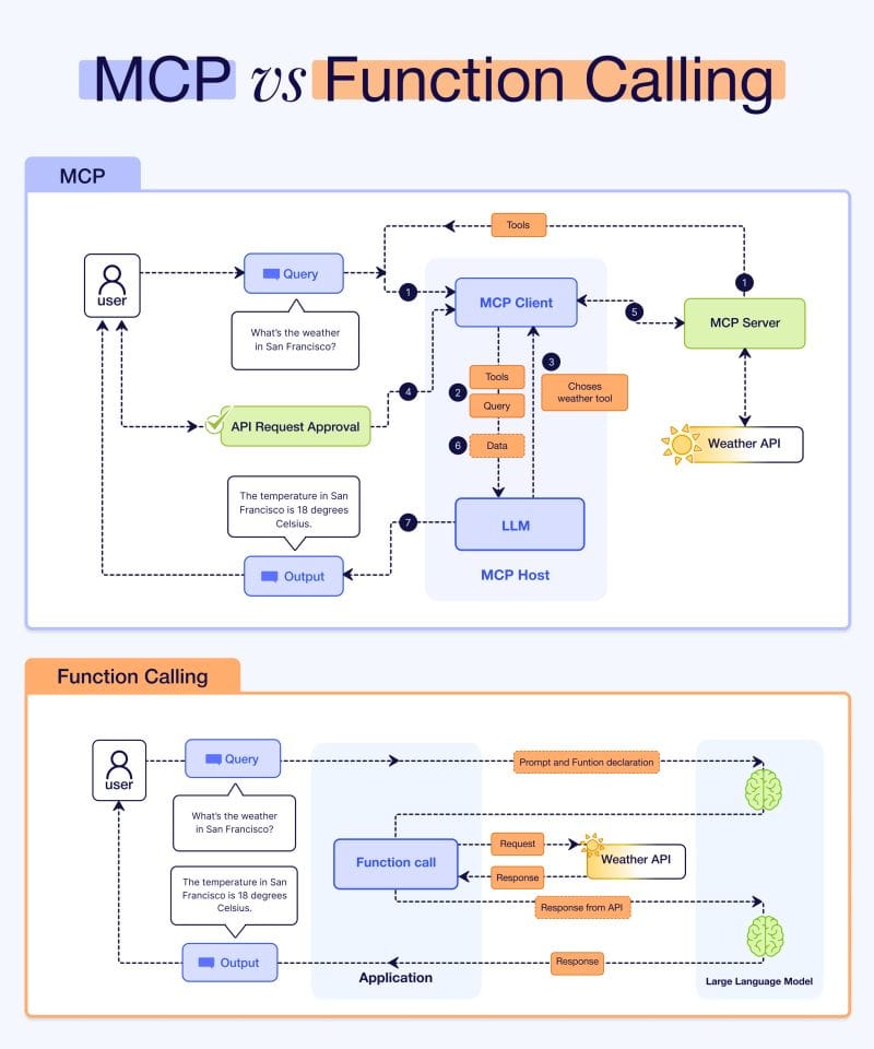 MCP와 함수 호출 (Function Calling)이 서로 배타적인 관계가 아니라 보완적인 개념임을 보여준 그림이 있어서 아래에 소개합니다: