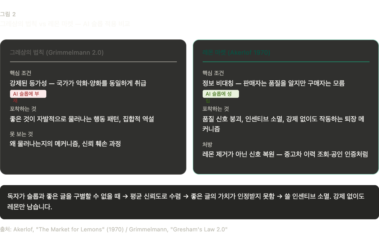 두 이론의 차이는 또, 이렇게 정리해 볼 수도 있습니다: 그레샴은 "좋은 것이 물러난다"는 현상을 포착하고, 레몬 마켓은 "왜 물러나는가"의 메커니즘을 설명하는 것으로요. AI 슬롭 문제를 해결하려면 현상이 아니라 메커니즘을 봐야 한다고 생각하고, 그래서 레몬 마켓이 더 유용한 틀이라고 생각합니다.