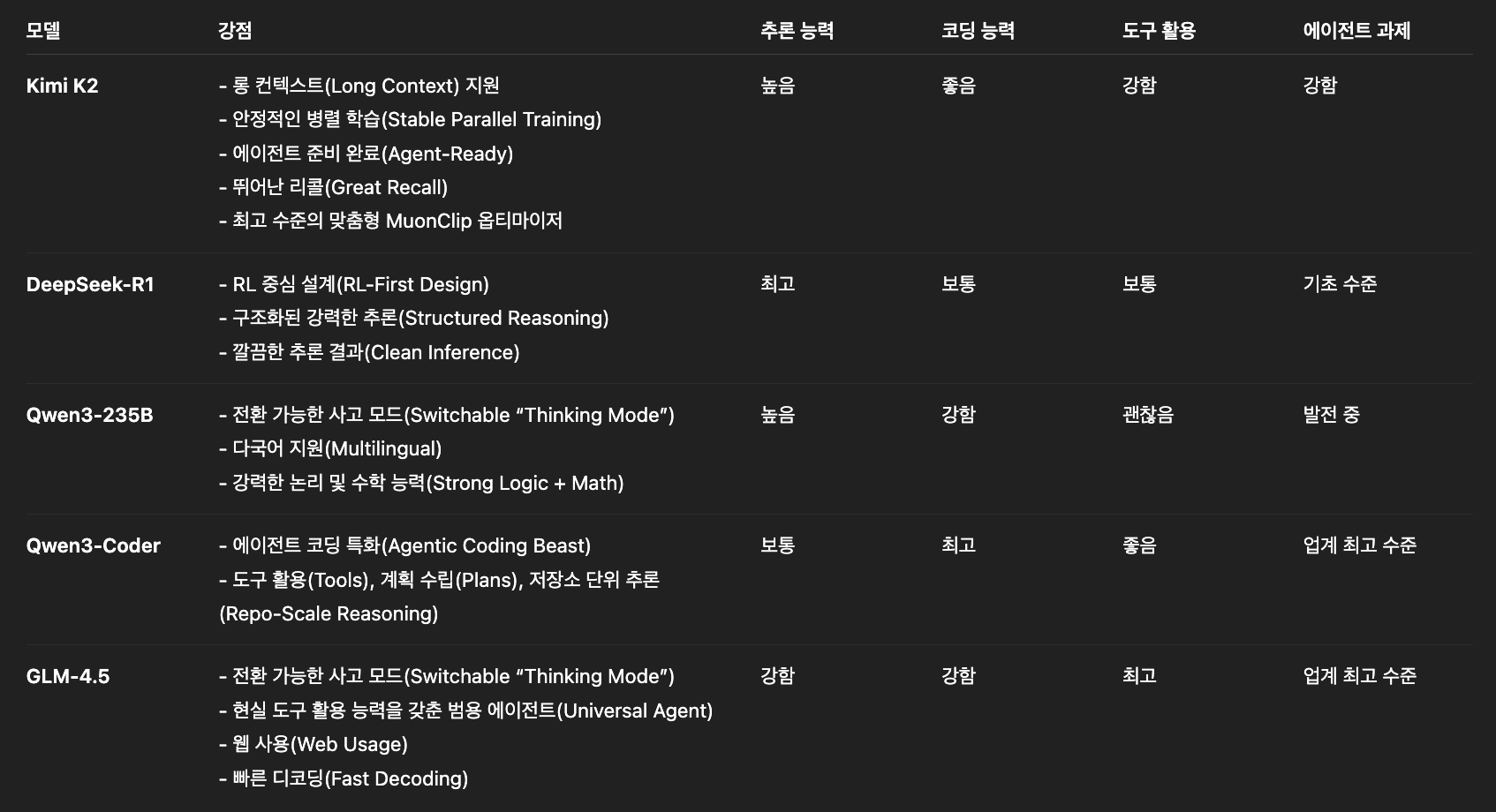 오늘 에피소드에서는, 중국으로부터 등장한 혁신적이고 강력한 네 가지 종류의 모델들, Kimi K2, DeepSeek-R1, Qwen3 및 Qwen3-Coder, 그리고 GLM-4.5를 간략히 살펴봤습니다. 아래 표에 각 모델의 장점과 서로 간의 경쟁 구도를 요약해 봤습니다: