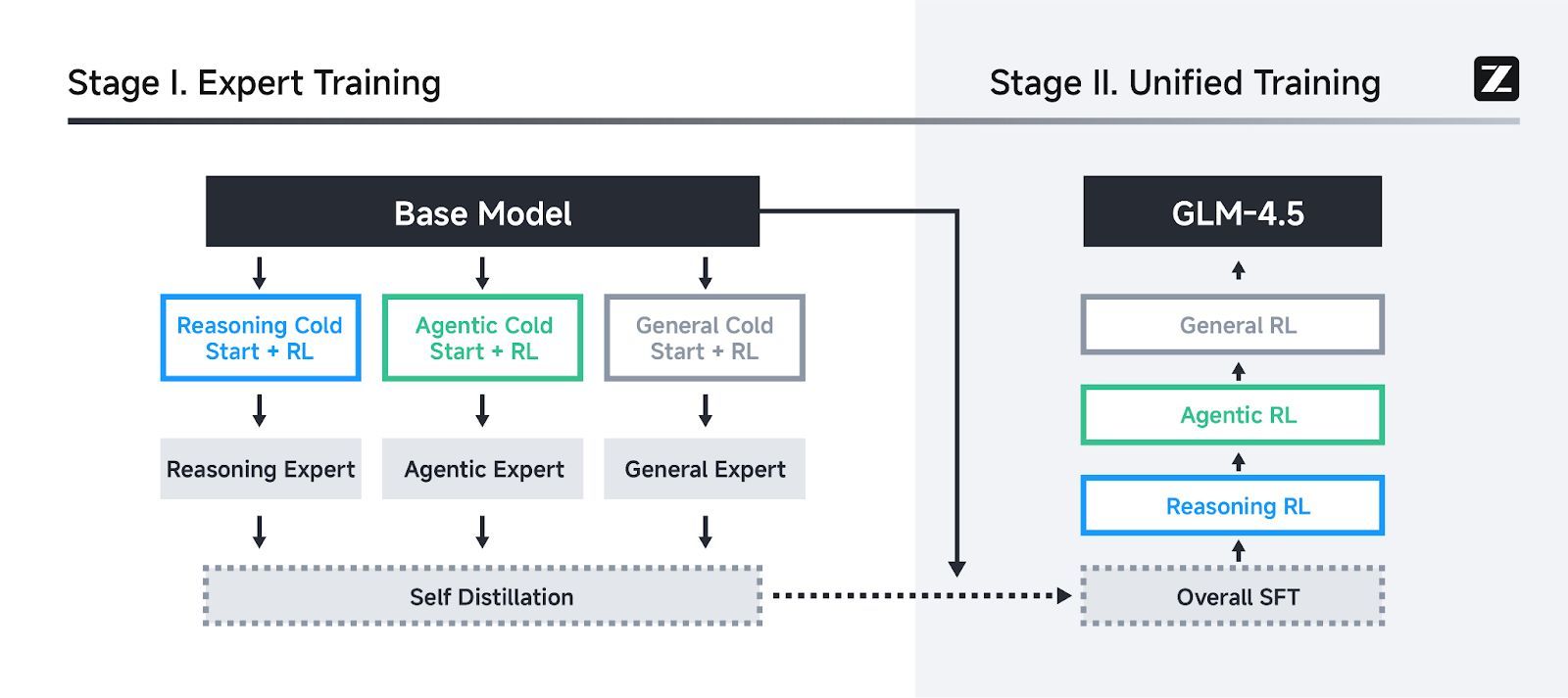 비록 특정한 소수의 도메인에 맞춰 학습을 시키기는 했지만, 이 과정에서 획득한 기술들은 다양한 상황에 꽤 넓게 일반화될 수 있고, 최종적으로는 단일 전문가 모델(Single Expert Model)인 GLM-4.5 하나에 응축, 통합되는 겁니다.