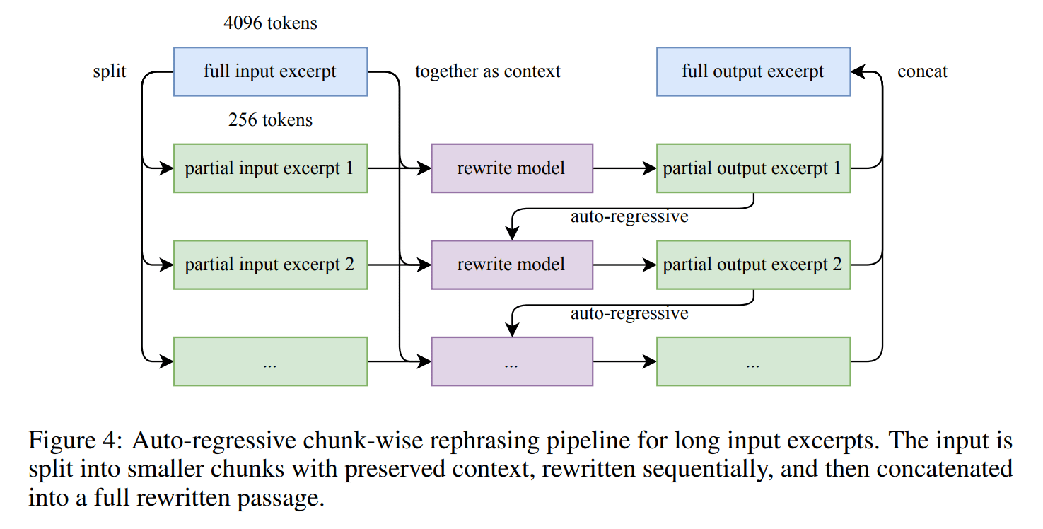 같은 사실이라도 문장을 다르게 표현해서, 모델이 보다 유연하게 지식을 이해하고 표현할 수 있도록 합니다.청크 기반 생성(Chunk-Based Generation): 긴 문서를 여러 조각으로 나누고 각각을 재표현한 후 다시 조립함