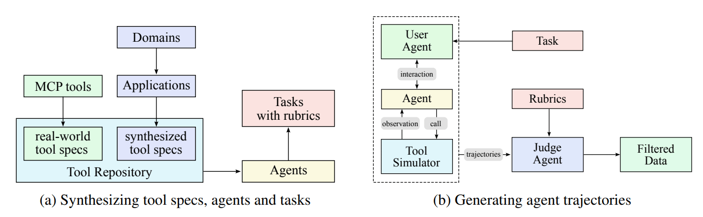 에이전트로서의 능력(Agentic Capabilities) 측면에서도, Kimi K2는 전용의 에이전트형 데이터 파이프라인(Agentic Data Pipeline)을 갖추고 있습니다. Moonshot AI는 ‘도구 사용’ 능력을 학습시키기 위해서 합성 데이터 파이프라인을 구축했다고 하는데, 이 과정에서 2만 개 이상의 가상 도구(Virtual Tools)와 수천 개의 에이전트(Agents)를 만들어 각각의 도구를 활용해서 문제를 해결하게끔 학습시켰습니다. 또, 각각 에이전트와 작업에 대해서 행동 경로(Agent Trajectories)를 생성했습니다.