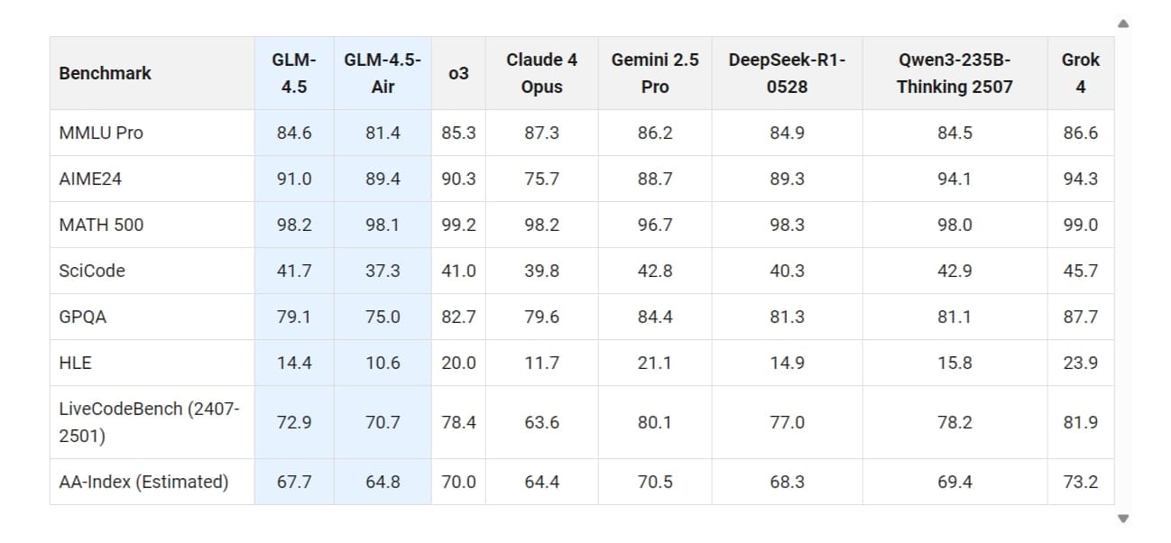 고급 추론(Advanced Reasoning)과 수학 중심 과제(Math-Heavy Tasks)에 있어서는, GLM-4.5는 강력한 성능을 보이지만 Qwen3와 DeepSeek-R1보다는 약간 뒤처지는 성능이라고 할 수 있습니다.