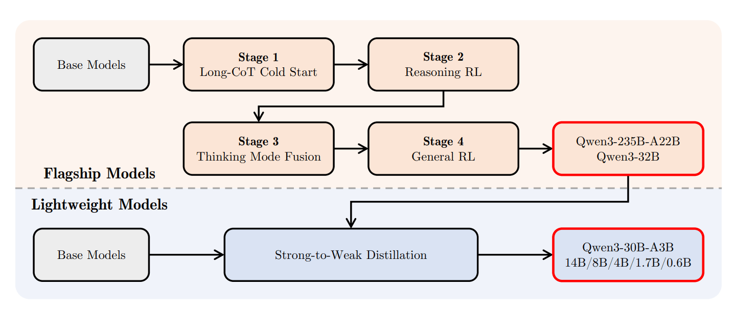 Qwen 팀은 널리 사용되는 기법이라고 할 수 있는, 강한 모델에서 약한 모델로의 지식 증류(Strong-to-Weak Distillation)를 활용합니다. 예를 들어서, Qwen3-235B와 같은 대형 모델에서 얻은 학습 결과를 더 작은 모델에 전이시켜 성능을 향상시키는 방식이죠. 이 방식은 전통적인 강화학습 방식보다 더 효율적이고 안정적인 결과를 가져올 수 있다는 장점이 있습니다.