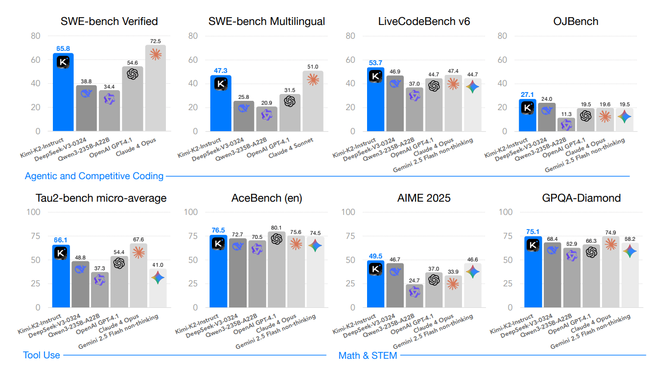 Kimi K2는 대부분의 논리 중심(Logical)적인 벤치마크에서 뚜렷한 성능 향상을 보여줍니다.