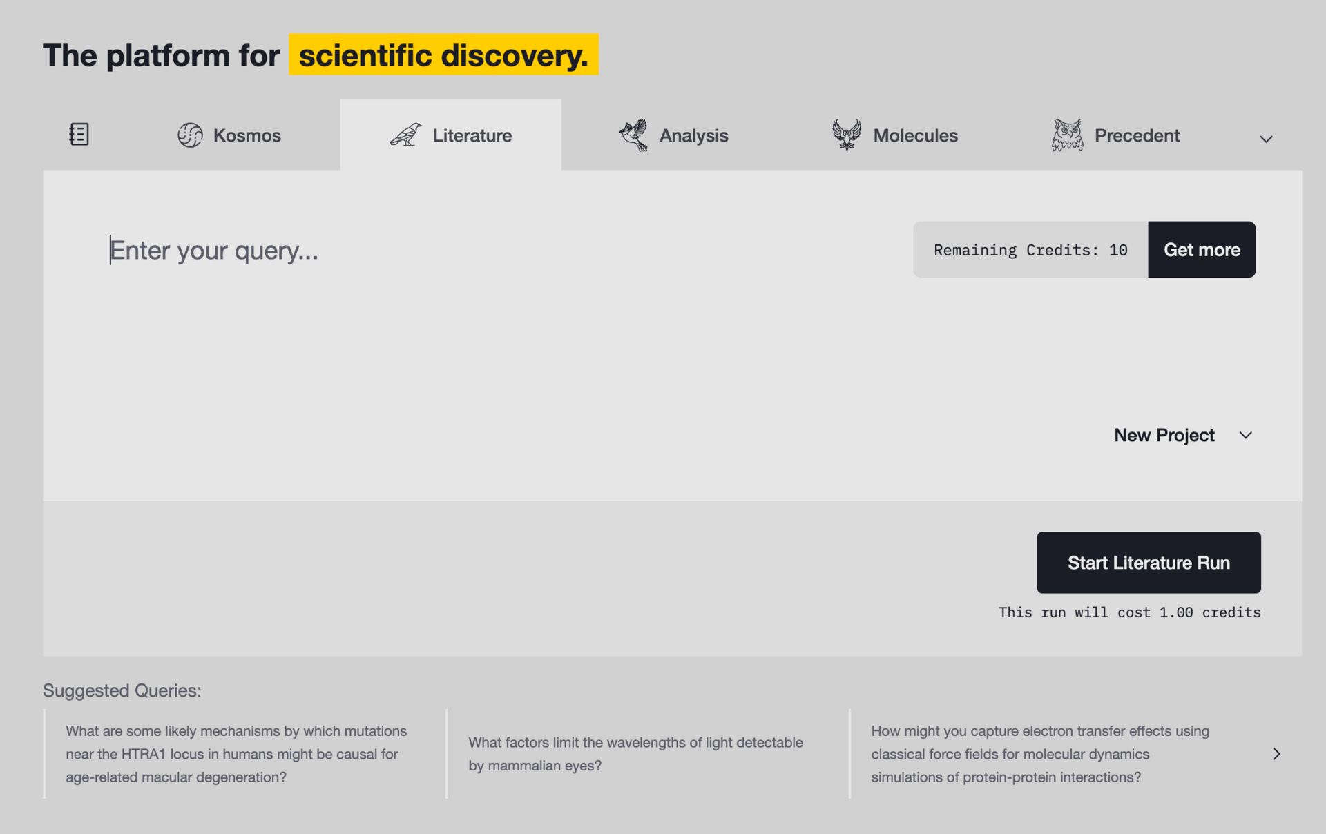 Kosmos는 바로 그 지점을 겨냥했습니다. 모델은 크레딧 기반으로 운영되는데, 무료 사용자는 10크레딧을 받습니다. 특정한 분야의 전문 에이전트와 대화할 때마다 1크레딧이 차감되고, 후속 질문도 마찬가지로 1크레딧이 듭니다.