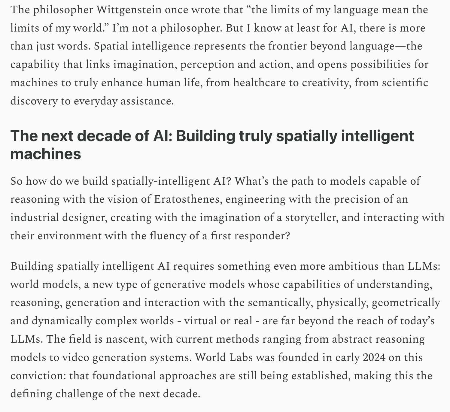 이 세 가지가 합쳐져야 비로소 진정한 공간 지능형 AI의 기반이 된다는 겁니다. 이 도전의 범위는 ‘지금까지 AI가 맞닥뜨린 어떤 과제보다도 더 크다’고 페이페이 리는 덧붙입니다.