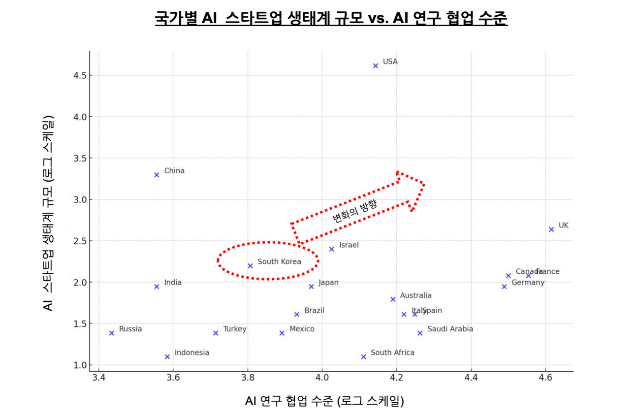 전세계 주요 국가의 ‘AI 스타트업 생태계 규모’를 해당 국가의 ‘국가간 AI 연구개발 협업 수준’과 비교해 봤습니다. X축의 AI 협업 수준은, 2022년 ~ 2024년 사이에 주요 컨퍼런스 (NeurIPS, CVPR, ICML, AAAI, ICJAI 등)에 나온 AI 연구 논문을 국가별로 300편씩 뽑아서 국제 공동연구 비율, 다기관 협업 비율을 보고 반영한 지표고, Y 축의 스타트업 생태계 규모는, 국가별 AI 스타트업에 대한 투자액, 유니콘 스타트업의 수, AI 스타트업 비율 등을 반영한 지표입니다.