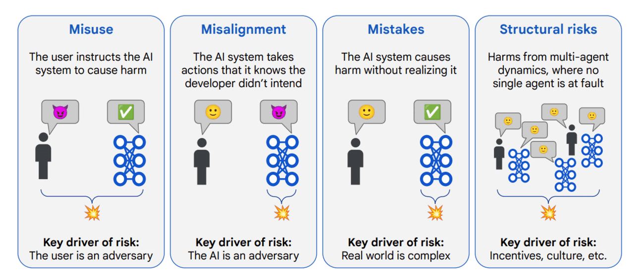 지난 주, 구글 딥마인드가 ‘An Approach to Technical AGI Safety and Security’라는 이름으로 흥미로운 논문을 발표했습니다. 이 논문에서는 아래와 같은 내용을 논의하는데요: