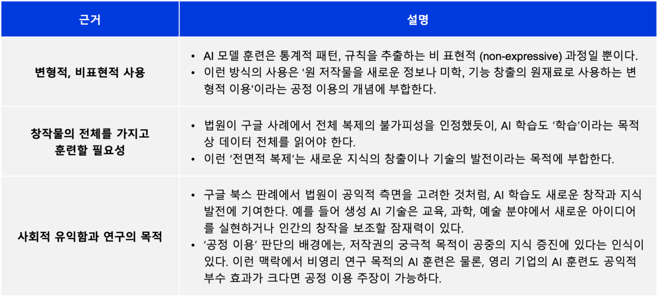 한편, 생성형 AI 모델 훈련에 학습 데이터를 활용하는게 구글 북스 사례와 구조적으로 또 다른 측면도 많이 있고, 이게 바로 법적 쟁점에서는 핵심이겠습니다: