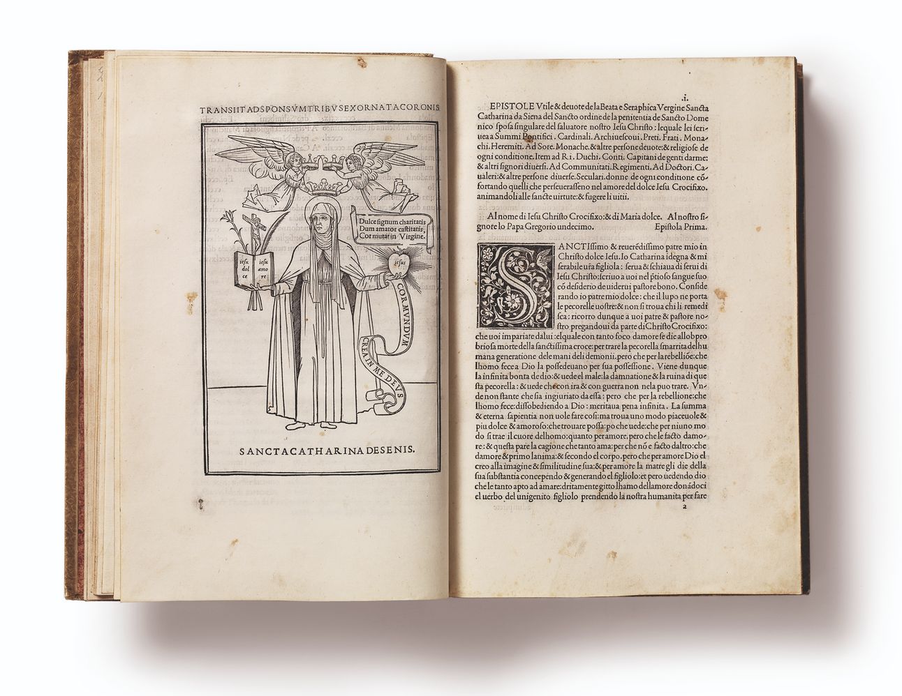 1500년 알두스가 출판한 “Letters of St. Catherine of Siena”. 이탤릭체가 사용 - 삽화 내 인물의 오른쪽 손에 든 책의 단어들 - 된 최초의 출판물. Image Credit: Tipoteca