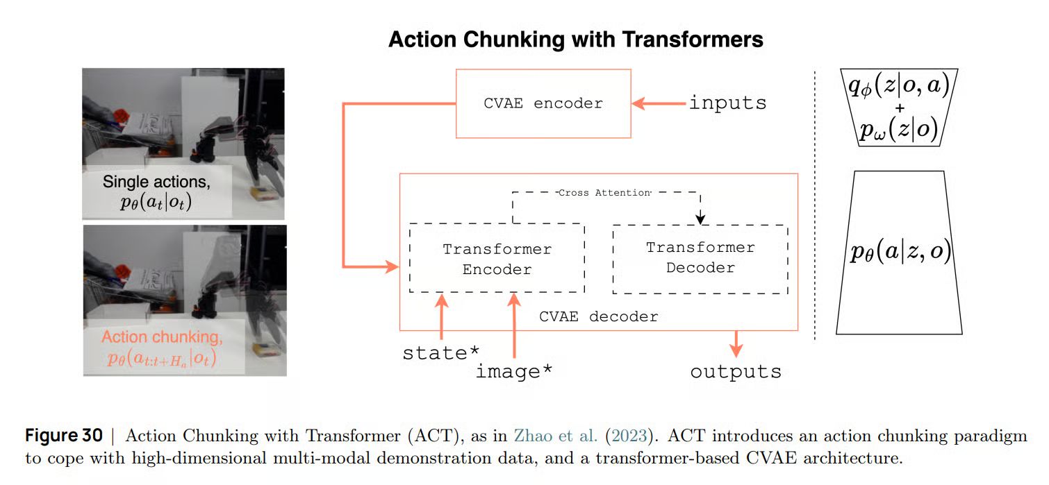 ACT (Action Chunking with Transformers) → Conditional VAE(CVAE)와 Transformer를 결합해서, 여러 연속된 행동을 하나의 덩어리(Chunk)로 학습합니다. 이렇게 해서 일관된 행동 시퀀스를 생성할 수 있고, 장기 작업(Long-horizon Tasks)에서의 오차 누적을 줄일 수 있습니다.