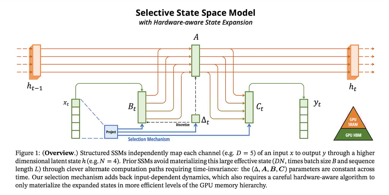 Mamba 아키텍처는 Attention이나 MLP (Multilayer Perceptron; 다층 퍼셉트론)과 같은 기존 구성 요소를 제거하고 ‘선택적 상태 공간 모델 (Selective SSM)’을 신경망 프레임웍에 통합합니다.