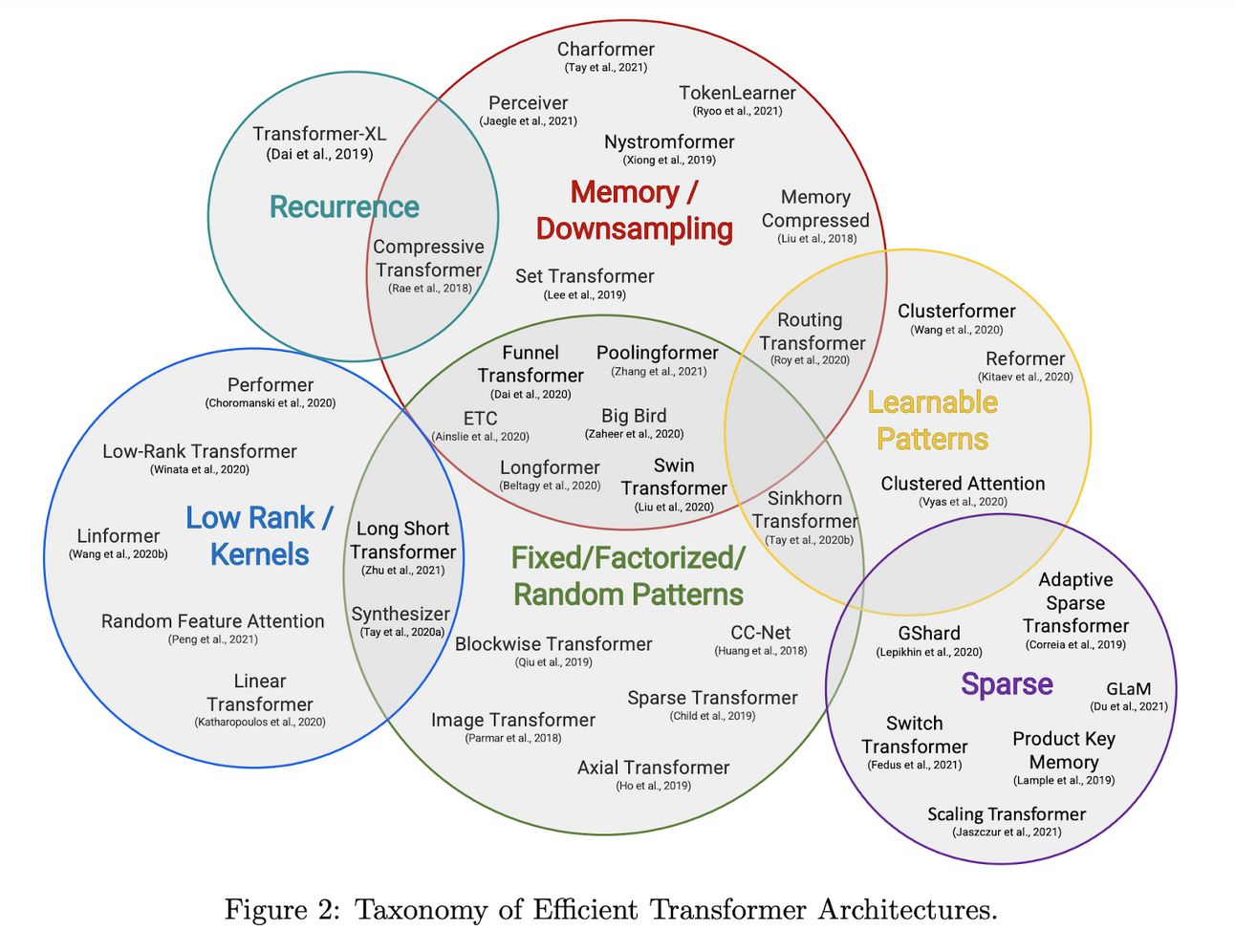 여기서 잠깐! 물론, Mamba와 같은 SSM 류의 모델들이 트랜스포머가 가진 특정한 제약 조건들을 해결해 주는 것은 사실이지만, 이 외에도 트랜스포머의 효율성을 향상시키기 위해 시도되고 있는 다른 많은 접근 방법도 있다는 것은 아셔야 합니다. “Efficient Transformers: A Survey” 논문에서는 위와 같은 여러가지 접근 방법에 대해 광범위한 논의와 조사를 한 바 있는데, 아래의 이미지에 그 방법들과 모델들이 나타나 있습니다. 예를 들어서, 지난 번 AI 101에서는 아래의 벤 다이어그램 오른쪽 아래에 위치한 ‘Sparse’ 카테고리로 분류된 MoE (Mixture-of-Experts) 모델에 대해 말씀드린 바가 있습니다.