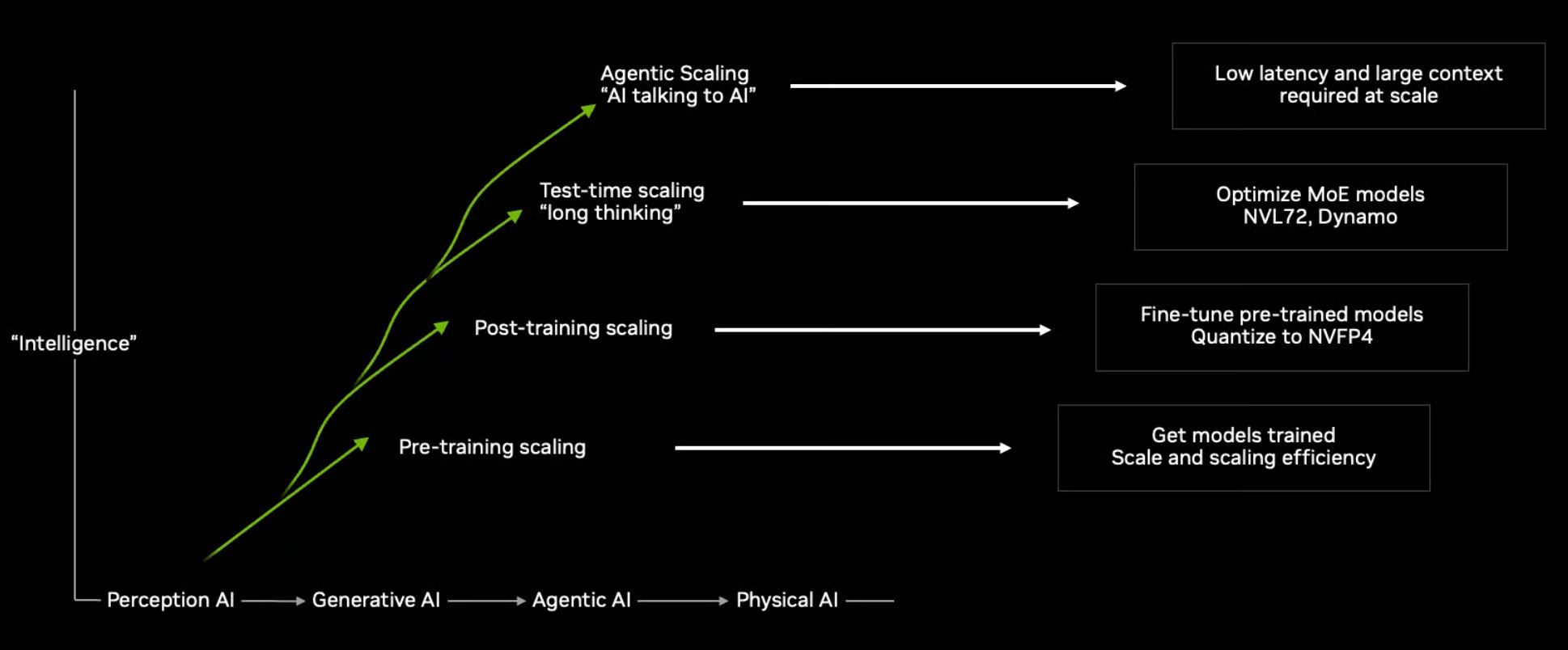 ์ง๋ 2๋ ๊ฐ AI ์ ๊ณ๋ ์ฌ์ ํ์ต(Pretraining), ์ฌํ ํ์ต(Post-training), ๊ทธ๋ฆฌ๊ณ ์ต๊ทผ์๋ ํ ์คํธํ์ ์ค์ผ์ผ๋ง(Test-Time Scaling)์ ๊ฐ์กฐํด ์์ต๋๋ค. ์ฌ๊ธฐ๋ค๊ฐ NVIDIA๋ ๋ค ๋ฒ์งธ ๋ฒ์น์ ์ถ๊ฐํ๋ ค๊ณ ํฉ๋๋ค: ๋ฐ๋ก ์์ด์ ํธ ์ค์ผ์ผ๋ง(Agentic Scaling)์ ๋๋ค.