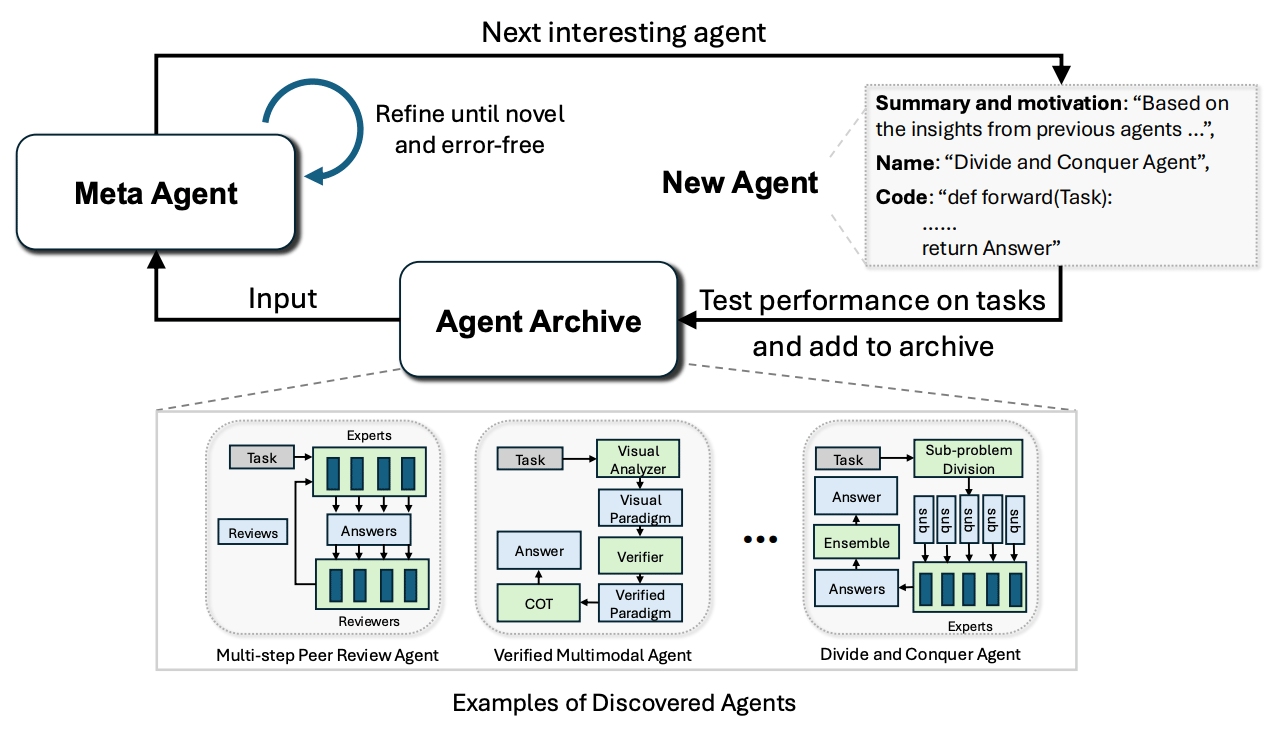 브리티시 컬럼비아 대학교, 그리고 벡터 인스티튜트 (Vector Institute)의 연구자들이 작성한 이 논문을 아주 간단히 요약하자면, ‘메타 에이전트’가 ‘Meta Agent Search’라는 알고리즘을 사용해서 ‘에이전트 시스템’을 학습, 개선하고 점진적으로 우수한 성능의 에이전트를 작성, 테스트하면 어떨까 하는 연구입니다. 실험의 결과를 보면, 이렇게 메타 에이전트를 통해 만들어진 에이전트가 수작업으로 설계된 에이전트보다 더 우수한 성능을 발휘하고, 도메인 간의 전이 학습에서도 그 성능을 유지하는 것으로 나타납니다. (물론, 이 연구는 초기 연구로, 메타 에이전트의 재귀적 개선 - Recursive Improvement - 과정이 완전히 자율적이 되려면 사람의 초기 입력과 가이드라인이 중요합니다)
