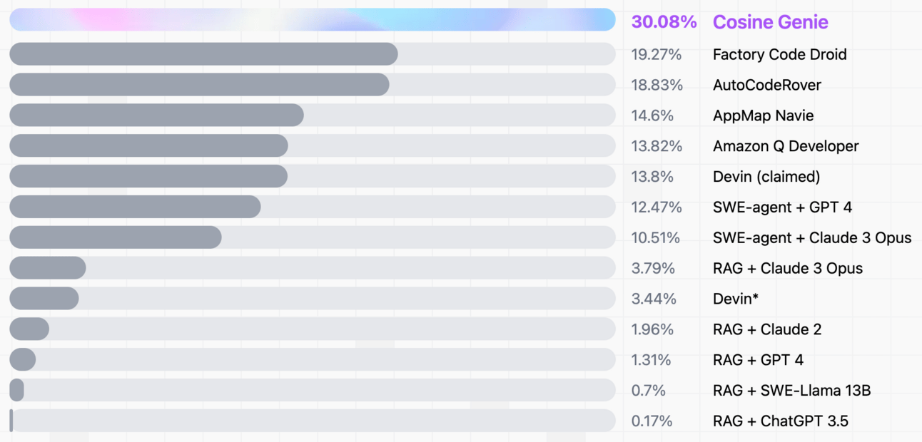 영국의 AI 스타트업 Cosine (코사인)에서 바로 며칠 전 지니 (Genie)라는 ‘소프트웨어 엔지니어링’을 위한 모델을 선보였는데요. 깃허브 리포지토리에서 수집한 약 2천 3백개의 소프트웨어 엔지니어링 문제로 구성된 ‘SWE-Bench’ 벤치마크에서 30.08%로 경쟁 모델들과 현격한 격차를 보이며 최고 성능을 보여줍니다.