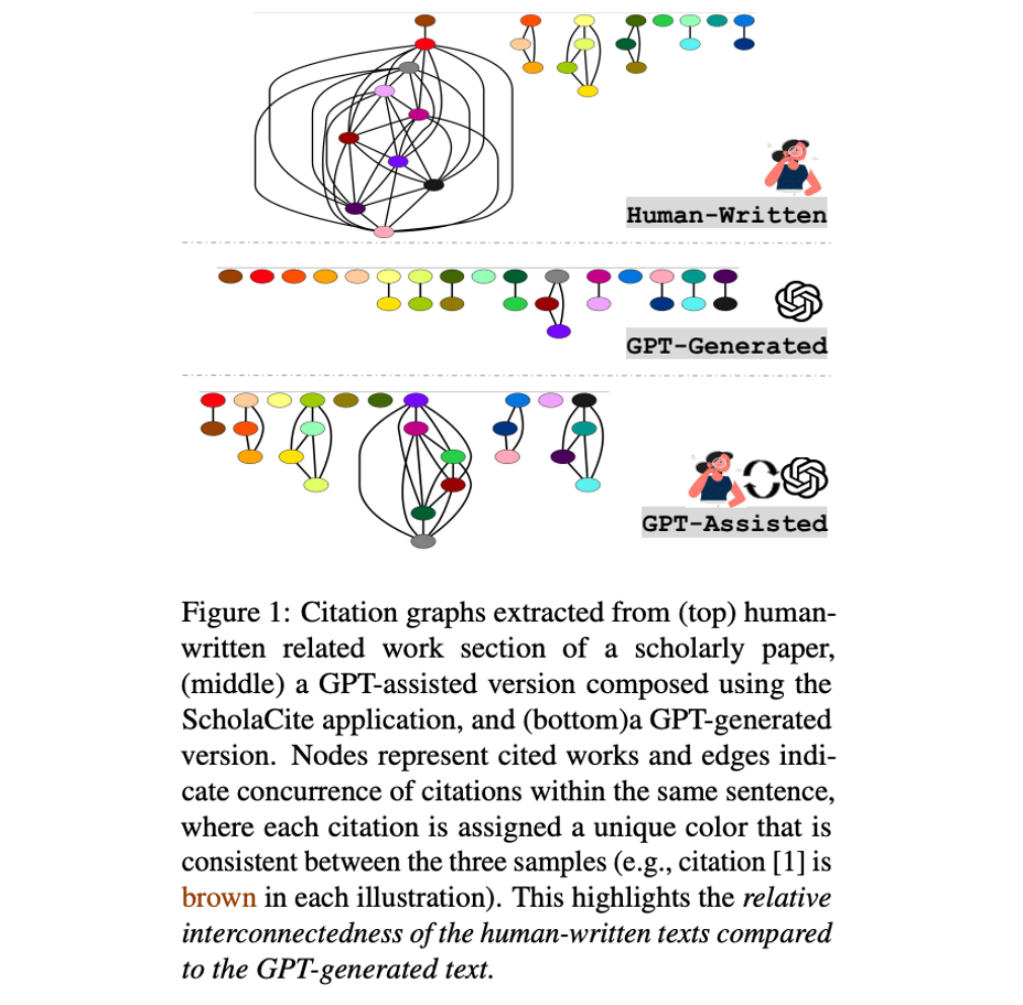 Sakana AI의 이번 논문은 ‘AI를 중심으로 연구 과정을 End-to-End로 자동화할 수 있는가’라는 질문에 대한 첫 번째 시도이니만큼, 섣불리 과도하게 기대할 이유도, 지나치게 폄훼할 필요도 없다고 봅니다. 예를 들어, 미네소타 대학교와 UC 버클리의 연구자들이 2024년 2월에 쓴 논문 ‘Shallow Synthesis of Knowledge in GPT-Generated Texts: A Case Study in Automatic Related Work Composition’에서 지적한 것처럼 ‘LLM이 자동적으로 생성하는 결과물이 과연 과학자나 연구자들이 하는 작업과 인지적으로 유사한 의미와 과정으로 결과를 만들어내는 작업인가’ 하는 질문에 과연 ‘AI Scientist’ 논문을 적용한 결과가 어떤 답을 주는지 등을 객관적으로 평가해 볼 필요가 있습니다. (밑의 그림을 보면, GPT가 생성한 Citation Graph는 사람이 직접 작업한 것과 많이 다를 뿐 아니라 ‘유의미하지 않은’ 그래프를 만들고 있습니다) - 한 편으로는, 지금의 arXiv에 올라오는 논문들의 숫자, 종류, 품질, 그리고 Peer Review 상황들을 본다면 ‘우리는 그렇게 타이트하게 하나’ 싶은 생각도 듭니다만 ^.^;