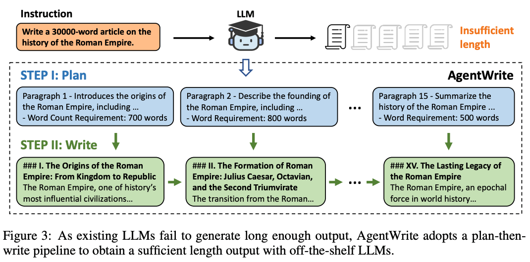 현재 Long-Context를 지원하는 거대언어모델들이 많죠? 크게는 100,000개에 달하는 입력 토큰도 받아주는 모델들이 있지만, 이런 거대한 모델들조차 2,000개 정도의 단어로 만들어진 여러 개의 문단들을 일관성있고 유의미하게 생성하는 작업은 쉽지가 않습니다. 이 논문의 실험 결과에 따르면, 이런 현상은 ‘지도학습 미세조정 (SFT; Supervised Fine-Tuning)’ 과정에서 아주 긴 텍스트 샘플이 별로 주어지지 않아서 발생한다고 합니다. 그래서 연구진들은 AgentWrite라는 이름의 ‘에이전트 기반 파이프라인’으로 아주 긴 문장을 생성하는 작업을 하위 작업들로 나눠서 ‘기성품 (Off-the-Shelf)’ LLM으로도 20,000 단어가 넘는, 그렇지만 일관성이 있는 긴 텍스트를 생성할 수 있도록 했습니다.