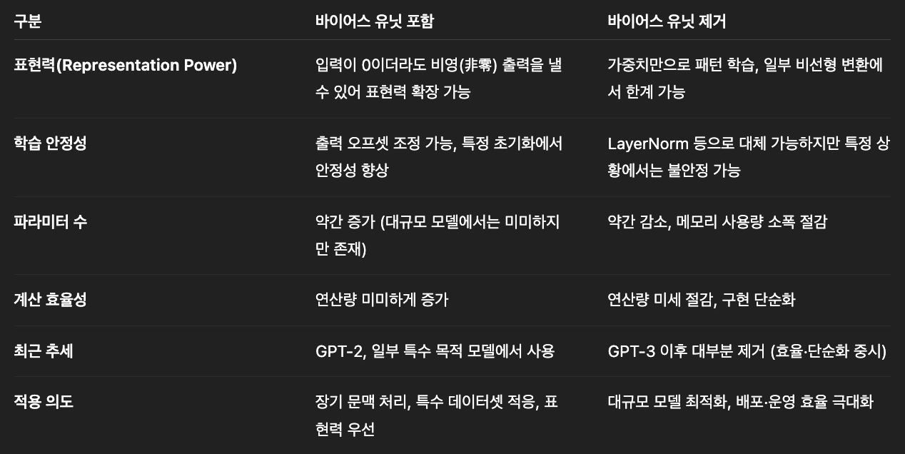 바이어스 유닛(Bias Unit)은 뉴럴네트워크 연산에서 y=Wx+b 함수에서 b처럼, 입력값 x와 관계없이 일정한 값을 더해주는 항으로, 출력 분포를 미세 조정하고 모델의 표현력을 확장하는 역할을 합니다. GPT-2까지는 어텐션 메커니즘에도 이러한 바이어스 유닛이 포함됐지만, GPT-3 이후 대규모 모델들은 파라미터를 절약하고 효율성을 높이기 위해서 이걸 제거하는 추세였죠.