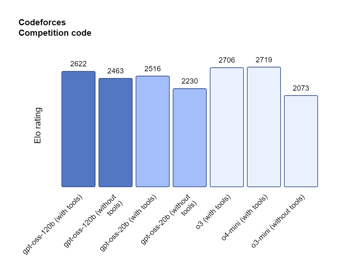 GPT-OSS 모델의 성능과 관련해서, 오픈AI는 gpt-oss-120B는 고난도 추론과 도구 사용 작업에서 o4-mini 같은 자사의 선도적인 폐쇄형 모델들과 동등하거나 그 이상을 보여준다고 주장합니다.