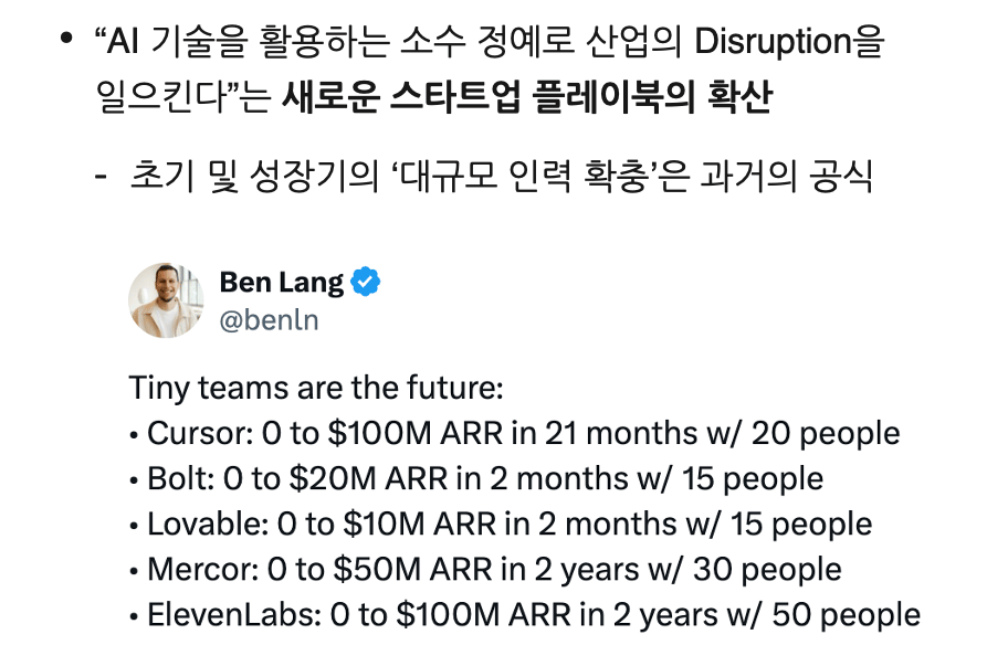 ‘개발’의 영역에 주로 해당하는 이야기이긴 하지만, Cursor AI, Windsurf, Midjourney 같은 미국의 AI 회사, AI 스타트업들은, 직원들의 개발 생산성이 AI를 적극적으로 활용하기 이전과 비교해서 300%에 가깝게 증가했다는 이야기를 저도 개인적으로 듣고는 합니다.