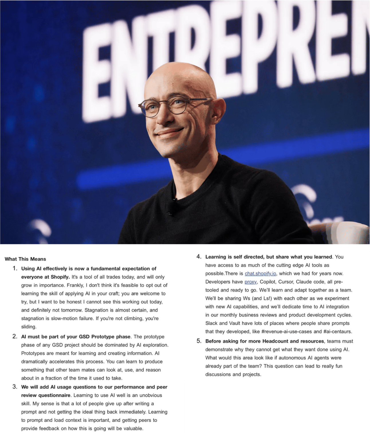 특히, 어떤 팀이든 ‘추가 인력이나 자원을 요청하기 전에 AI를 사용해서 원하는 일을 할 수 없는 이유를 설득해야 한다’, ‘앞으로는 사람만이 할 수 있는 일이라는 확인이 되어야 신규 채용을 하겠다’는 파격적인 ‘AI 우선 전략’을 공식화하면서 서 큰 화제가 되었습니다 - 메모가 유출되고 이에 대해 토비가 언급한 내용이 수백만 회 이상 조회되었으니까요.