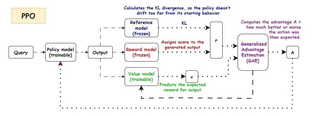 PPO는 보상 모델로부터 받은 피드백을 이용해서, 모델 출력의 품질을 평가합니다.