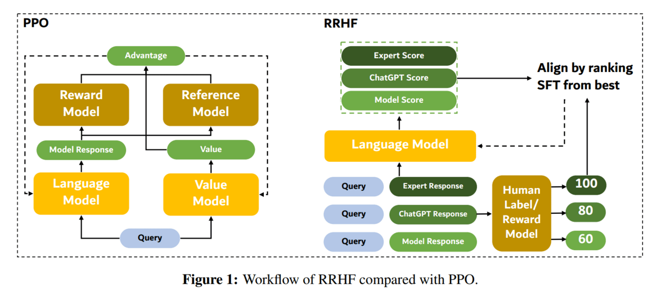 훨씬 가볍습니다 – PPO는 최대 4개의 모델을 필요로 하지만, RRHF는 1~2개의 모델만으로 작동하기 때문에 메모리 사용량이 훨씬 적습니다.