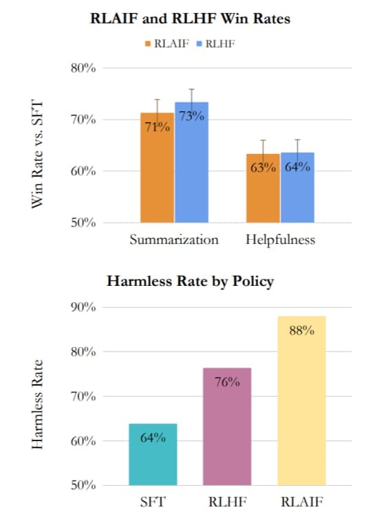 실험 결과에 따르면, RLAIF는 RLHF와 동등한 성능을 달성할 수 있고, 해로움(Harmlessness) 측면에서는 오히려 더 우수한 성능을 보였고, 훈련 비용은 10배 이상 절감할 수 있었다고 합니다.