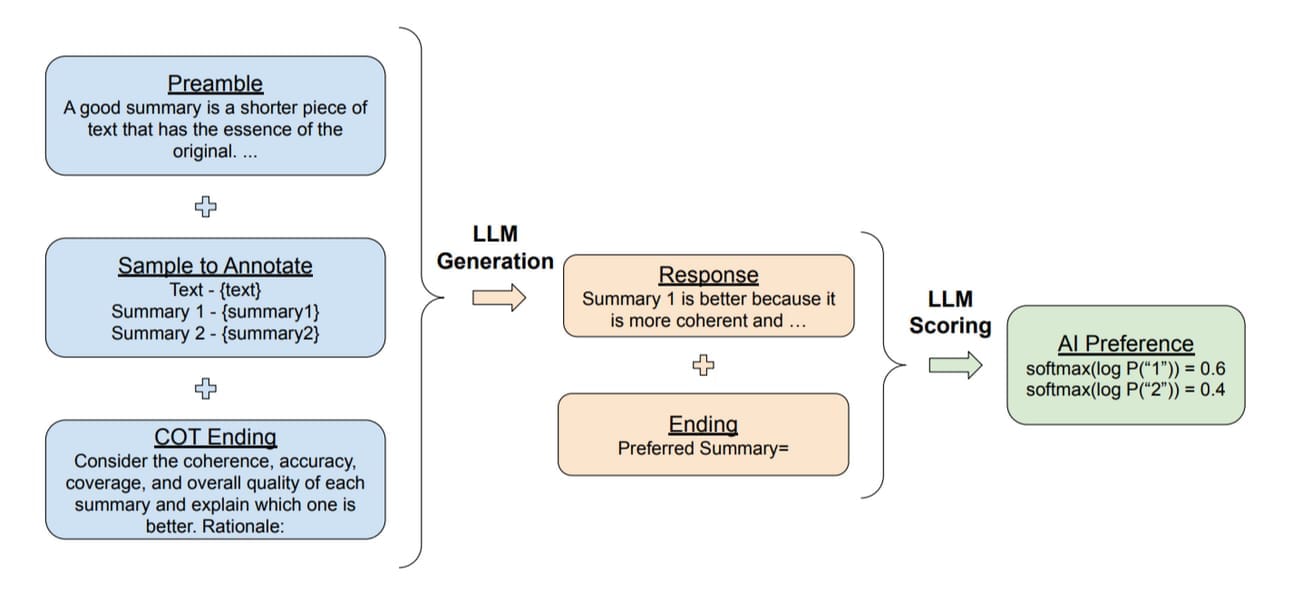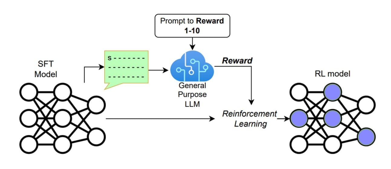강화학습 파이프라인에서 사람 평가자(Human Annotator)를 대체하기 위해서, 연구자들은 특정한 작업에 특화되지 않은 범용 LLM(대형 언어 모델)을 사용했습니다. 이 모델은, 주어진 입력에 대해서 두 개의 응답 중 어떤 것이 더 나은지를 선택하도록 프롬프트(Prompt)를 통해서 지시를 받습니다.