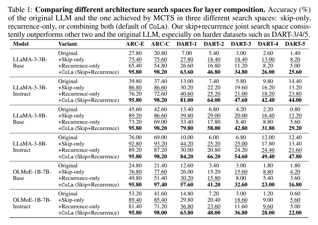 실험 결과에서 볼 수 있듯이, CoLa를 통해서 테스트-타임(Test-Time)에서 레이어를 다이나믹하게 건너뛰거나 반복하는 방식은 고정된 시퀀스를 사용하는 것보다 일관되게 더 나은 성능을 보여줬습니다. MCTS가 가이드하는 레이어 건너뛰기, 반복, 재배열을 통해서 이미 모델 안에 숨겨져 있던 성능을 끌어낼 수 있는 겁니다. 예를 들어서: