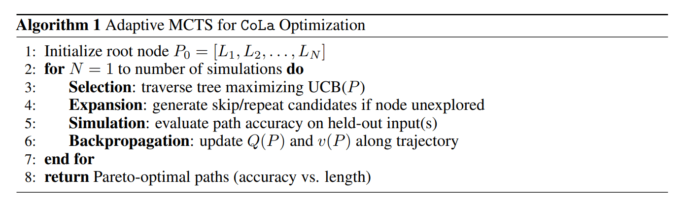 CoLa 기법에서, MCTS는 서로 다른 레이어 경로를 시도해 보면서 가능한 한 적은 레이어로도 정확한 예측을 만들어 내는 경로를 탐색하는데요. 그 작동 방식은 다음과 같습니다: