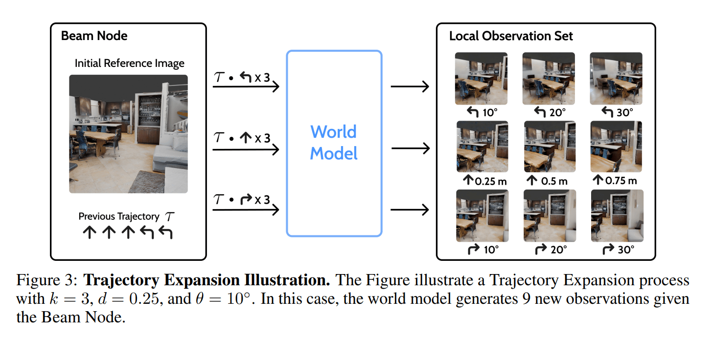 월드 모델(World Model)은 비디오 디퓨전(Video Diffusion)을 기반으로 해서, 한 장의 이미지와 방금 계획된 카메라 움직임을 입력으로 받아서 새로운 관점에서 장면이 어떻게 보일지를 그려낸 짧은, 상상의 비디오 프레임(Imagined Video Frame)을 생성합니다. 즉, 정적인 2D 이미지를 모델이 탐색할 수 있는 가상 3D 환경으로 바꿔 주는 겁니다.