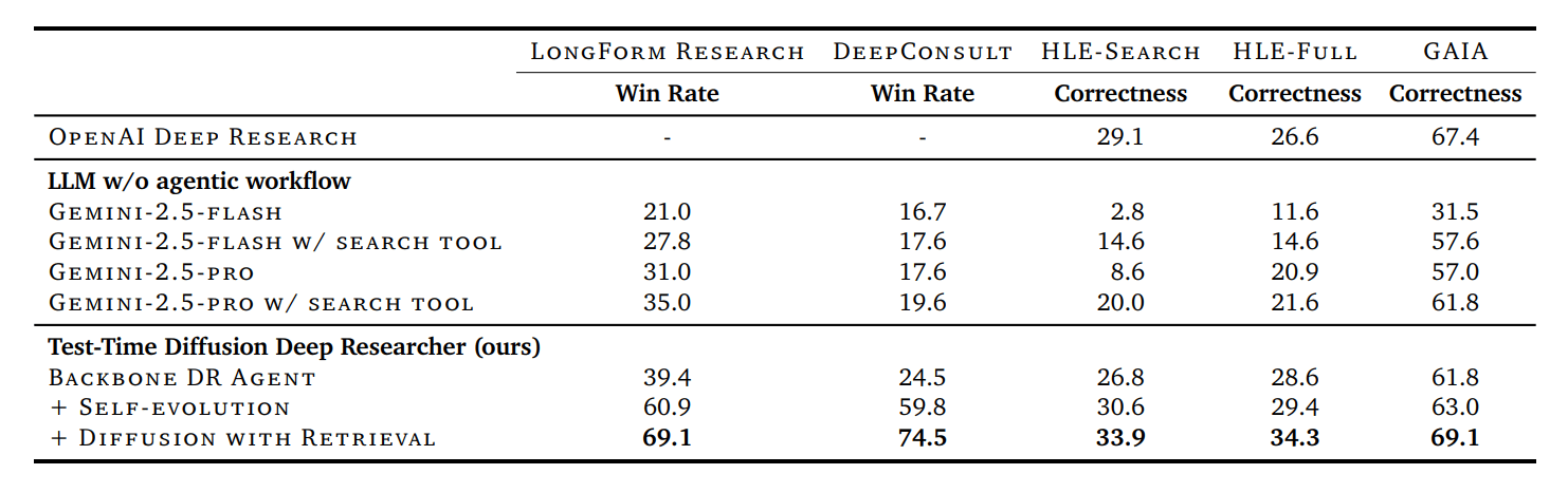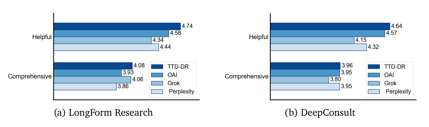 성능 결과 수치를 기준으로, TTD-DR은 기존의 딥 리서치(Deep Research) 에이전트들을 능가하는 수준을 보여주고 있습니다.