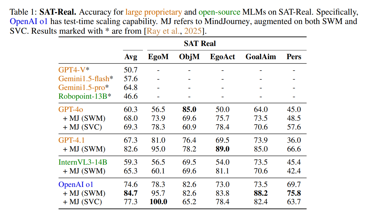 자기중심적 움직임(Egocentric Motion), 객체 움직임(Object Motion), 행동의 결과(Action Consequences), 관점의 전환(Perspective Shifts), 목표 지향적 내비게이션(Goal-directed Navigation) 등 5가지 모든 공간 추론 유형에서 정확도가 높아졌습니다.